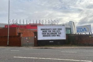 在老特拉福德外,有一个横幅这样写道:移民对这座城市的贡献远超那些逃税的亿万富翁。