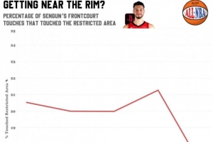 申京各个赛季在前场拿球时禁区触球占比,本赛季仅16.6%,创生涯新低