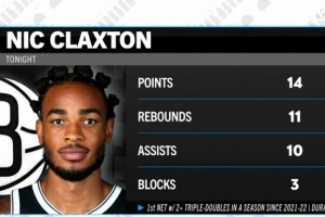 据统计,这是21-22赛季杜兰特和哈登后,篮网首位单赛季至少2次三双的球员。