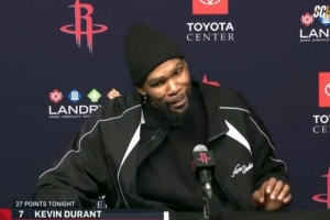 体育资讯3月22日讯 NBA常规赛,火箭主场123-122险胜热火。赛后杜兰特接受采访,他透露队友们在更衣室泼水为他庆祝得分超越乔丹的里程碑。