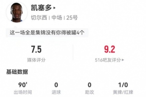 体育资讯12月20日讯 切尔西在本轮英超2-2战平纽卡,凯塞多本场数据如下: