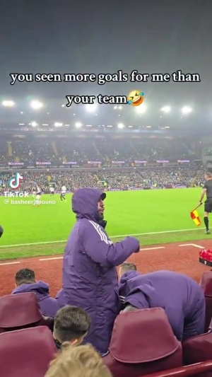 下半场在替补席上,B费遭到场边维拉球迷的嘲讽,他笑着站起来与维拉球迷“互动”。
