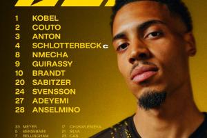 多特蒙德首发:1-科贝尔、2-扬·库托、3-安东、4-施洛特贝克、8-恩梅查、9-吉拉西、10-布兰特、20-萨比策、24-斯文松、27-阿德耶米、28-安塞尔米诺