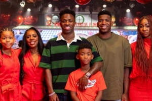 照片中,维尼修斯身穿休闲的绿黑条纹衫,笑容灿烂,被身着红色节日盛装的亲友环绕。
