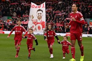 在比赛开场前,利物浦队长范戴克带领若塔的孩子们在安菲尔德球场踢球。