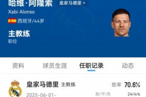 体育资讯01月13日讯 皇马官宣主帅阿隆索下课,自从夏窗加盟后,阿隆索带队出战34场比赛,取得24胜4平6负,胜率为70.6%。