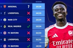 德转也盘点了此前9支赛季前7场欧冠全胜的球队最终战绩,其中仅23/24赛季的皇马、19/20赛季的拜仁最终夺冠,其余包括利物浦、曼城、巴萨、米兰等球队最终均无缘冠军。