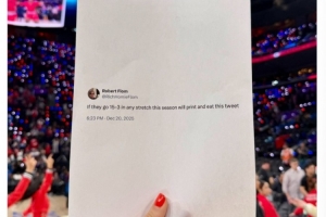 此前,一位网友曾表示,如果快船本赛季能够在任意阶段取得15胜3负,他将打印这条推文并吃掉,这段推文今天被展示在快船的球迷墙。