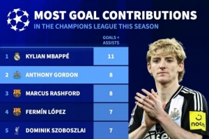 下一篇: 本赛季欧冠参与进球数:姆巴佩11球居首,戈登、拉什福德8球次之