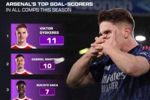 阿森纳本轮英超4-0客胜利兹联,目前枪手本赛季的队内各项赛事射手榜情况如下: